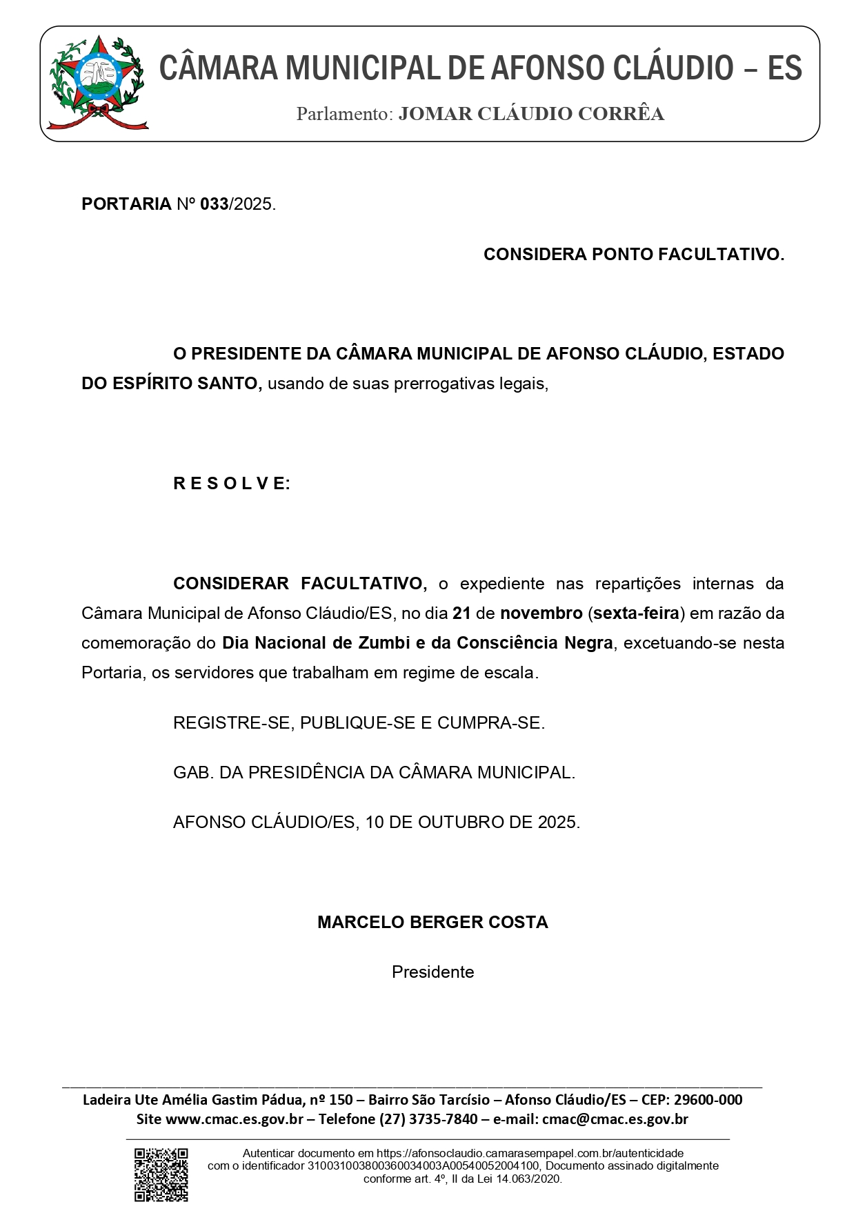 Endereço: Ladeira Ute Amélia Gastin Pádua, nº 150 - São Tarcísio Afonso Cláudio – ES - CEP: 29600-000 Telefone: 27 3735-7840 E-mail: cmac@cmac.es.gov.br